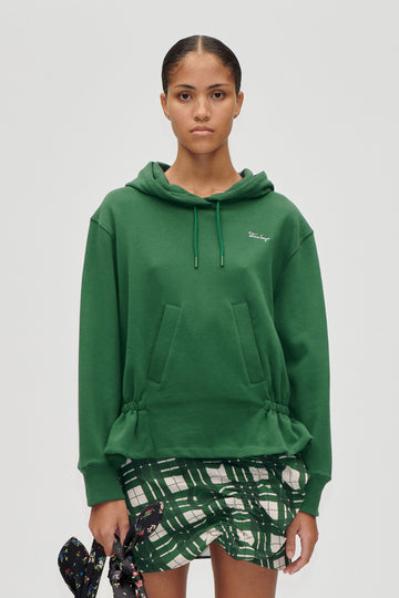 Green sweatshirt crafted from cotton with a soft finish. Features a drawstring hood, front patch pockets, and a cinched waist with subtle ruffle detailing at the back. Finished with an embroidered STINE GOYA logo at the chest.